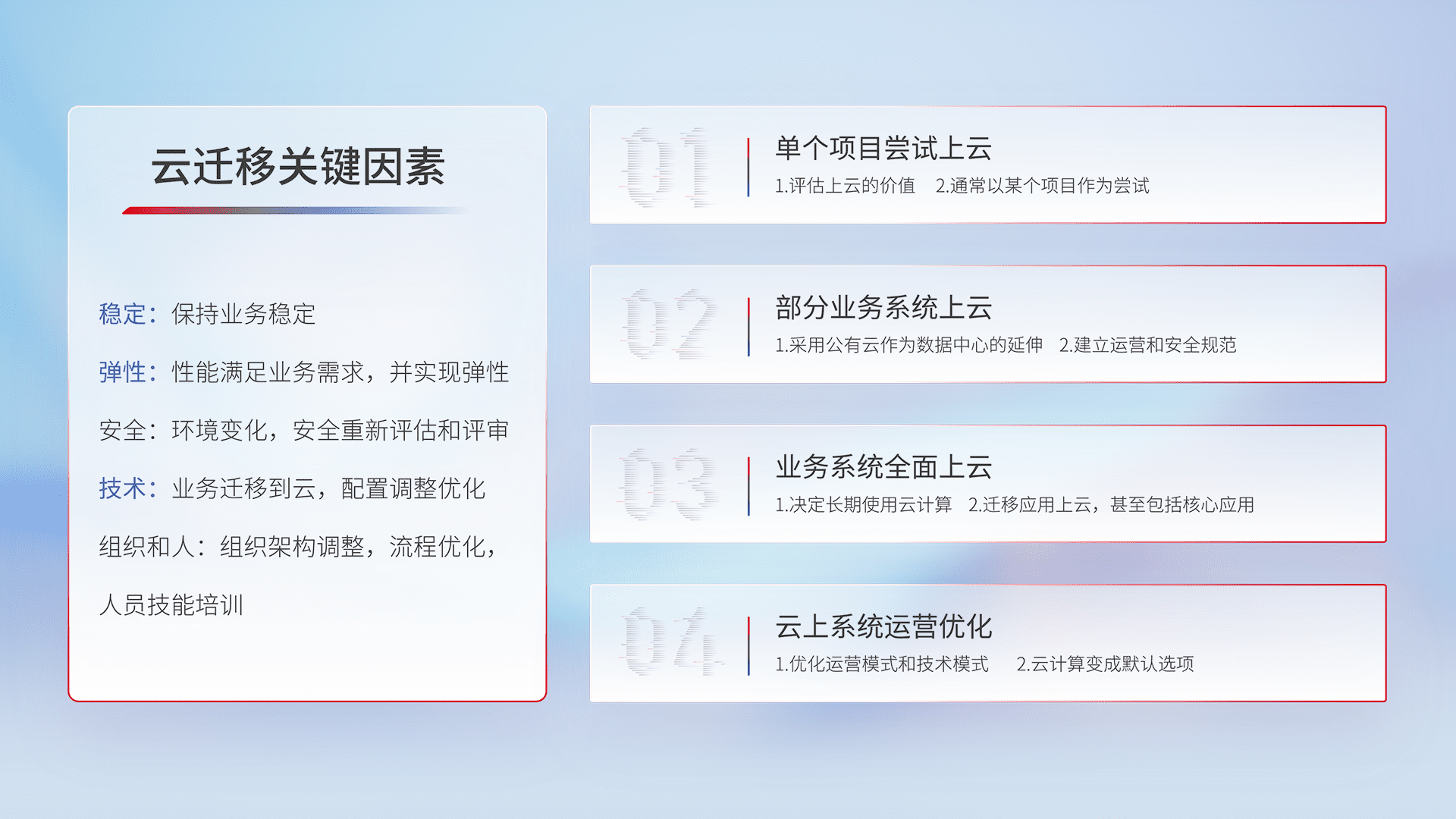 结合实际业务,,,从规划设计、、云平台选型、、、、云原生改造、、、数据迁移、、集成交付,,,迁移全过程为客户识别最佳上云路径,,做好风险识别管理,,,设计网络架构、、身份权限、、安全审计合规、、、操作审计、、、日志审计、、、、监控告警策略、、、多站点容灾设计等,,,,对云上基础设施进行整体规划,,提升IT治理水平,,,,以满足弹性、、高可用、、、、高性能的需求。。