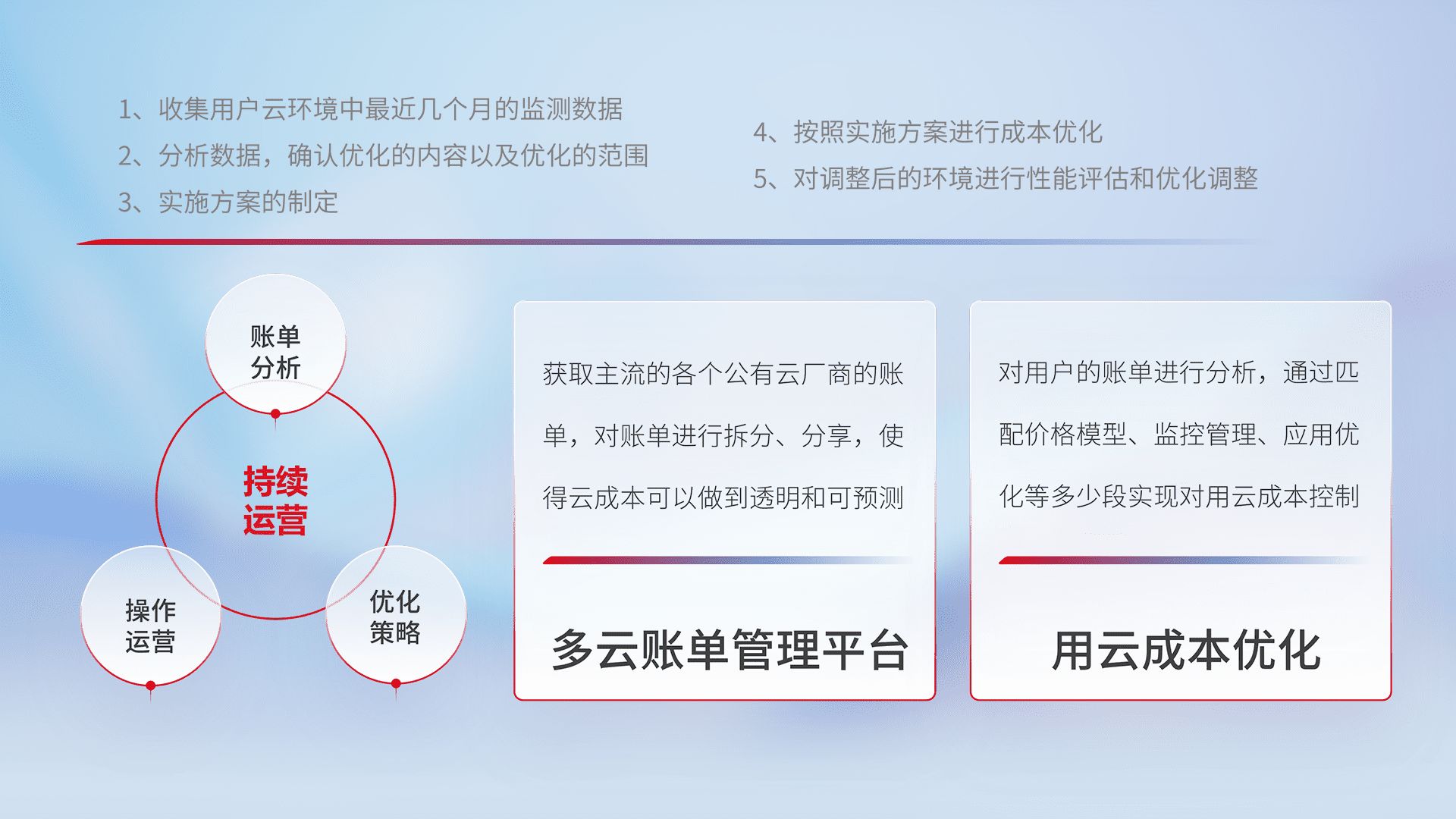 通过多云纳管,,以统一的资源数据模型把客户的云资源进行抽象和封装,,进而实现对多云资源的统一操作,,,,保障云资源管理的可靠性、、、稳定性与可用性。。量身定制化运维内容,,配置、、、开发运维、、、、补丁管理、、备份、、、、监控、、认证和访问管理、、审计和日常巡检等,,,,保障在用云过程中的可靠度,,,稳定度以及高可用率。。。